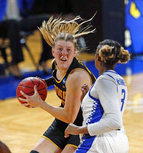 Iowa forward Monika Czinano (25) prepares to drive by Kentucky forward Keke McKinney (3) during the first half of a college basketball game in the second round of the women's NCAA tournament at the Greehey Arena in San Antonio, Texas, March 23, 2021. (AP Photo/Ronald Cortes) The Associated Press