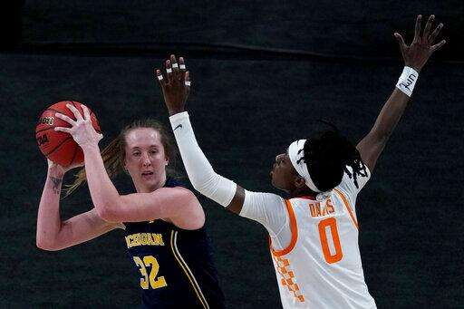 Michigan forward Naz Hillmon passes under pressure from Tennessee guard Jordan Walker (4) during the second half of a college basketball game in the second round of the women's NCAA tournament at the Alamodome in San Antonio, Tuesday, March 23, 2021. Michigan won 70-55. (AP Photo/Charlie Riedel) The Associated Press