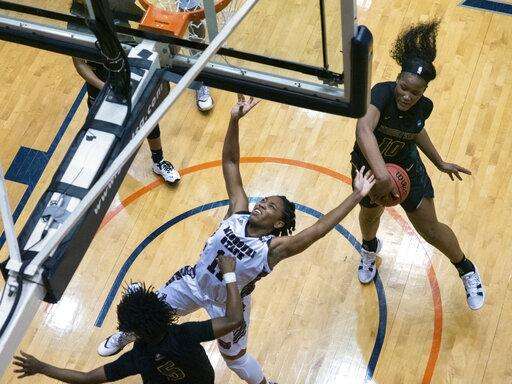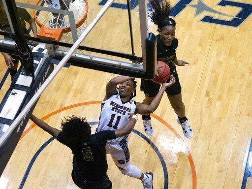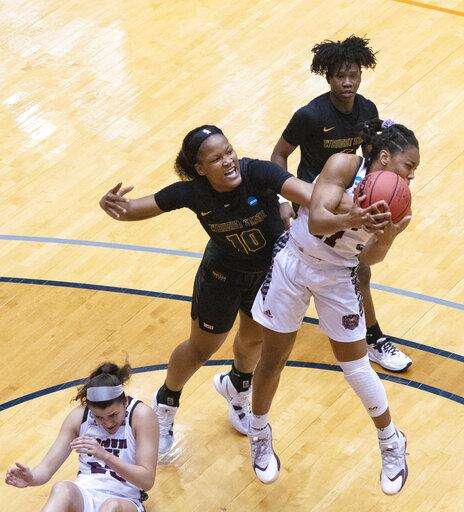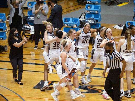 Missouri State went ahead on two tiebreaking free throws by Missouri Valley Conference player of the year Brice Calip with 2 minutes left in the second quarter before Mya Bhinhar swished a 3-pointer for a 24-19 halftime lead. Sydney Manning's 3-pointer capped a 12-3 run to start the second half. That trio was also on the last Sweet 16 team.