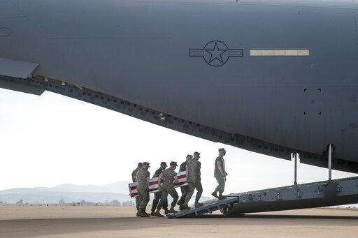 FILE - In this Aug. 12, 2020, file photo, provided by the U.S. Marine Corps, U.S. Marines and sailors carry a casket aboard a U.S. Air Force C-17 Globemaster III at Marine Corps Air Station Miramar, in Calif. The remains included seven Marines and a sailor, who died after a seafaring tank sank off the coast of Southern California were transferred to Dover Air Force Base in Delaware for burial preparations. The U.S. Marine Corps is expected to release results of its investigation into a seafaring tank that sunk off San Diego's coast last summer, killing eight Marines and one sailor. (Staff Sgt. Kassie McDole/U.S. Marine Corps via AP, File) The Associated Press