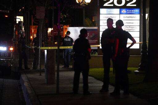 Police officers stand outside a business building where a shooting occurred in Orange, Calif., Wednesday, March 31, 2021. Police say several people were killed, including a child, and the suspected shooter was wounded by police. (AP Photo/Jae C. Hong) The Associated Press