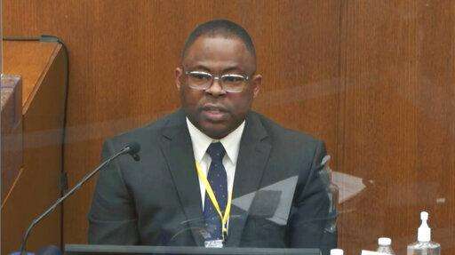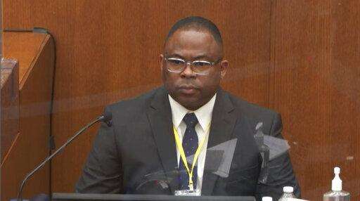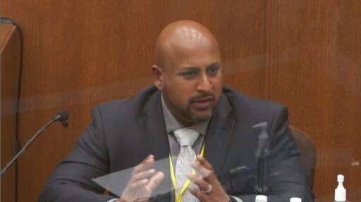 In this image from video, witness Jody Stiger, a Los Angeles Police Department sergeant, testifies as Hennepin County Judge Peter Cahill presides Wednesday, April 7, 2021, in the trial of former Minneapolis police Officer Derek Chauvin at the Hennepin County Courthouse in Minneapolis. Chauvin is charged in the May 25, 2020 death of George Floyd. (Court TV via AP, Pool)