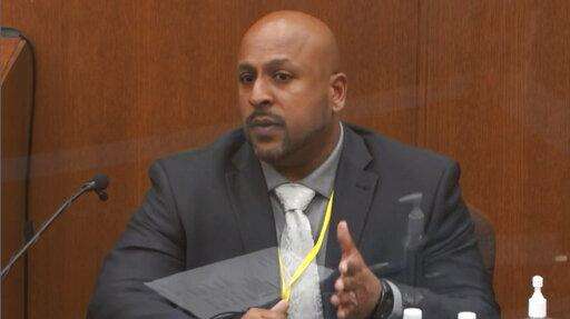 In this image from video, witness Jody Stiger, a Los Angeles Police Department sergeant testifies as Hennepin County Judge Peter Cahill presides Wednesday, April 7, 2021, in the trial of former Minneapolis police Officer Derek Chauvin at the Hennepin County Courthouse in Minneapolis. Chauvin is charged in the May 25, 2020 death of George Floyd. (Court TV via AP, Pool)