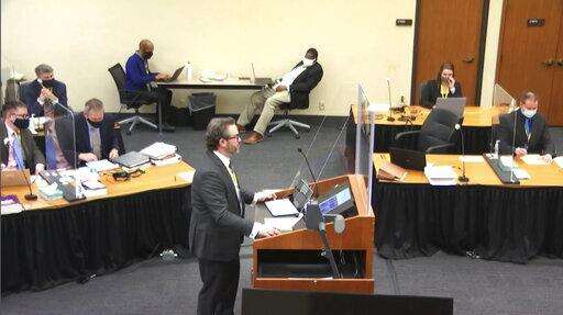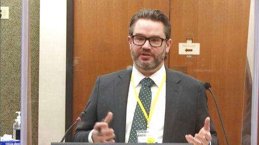 In this image taken from video, prosecutor Matthew Frank interviews witness Senior Special Agent James Reyerson of the Minnesota Bureau of Criminal Apprehension as Hennepin County Judge Peter Cahill presides Wednesday, April 7, 2021, in the trial of former Minneapolis police Officer Derek Chauvin at the Hennepin County Courthouse in Minneapolis. Chauvin is charged in the May 25, 2020 death of George Floyd. (Court TV via AP, Pool)