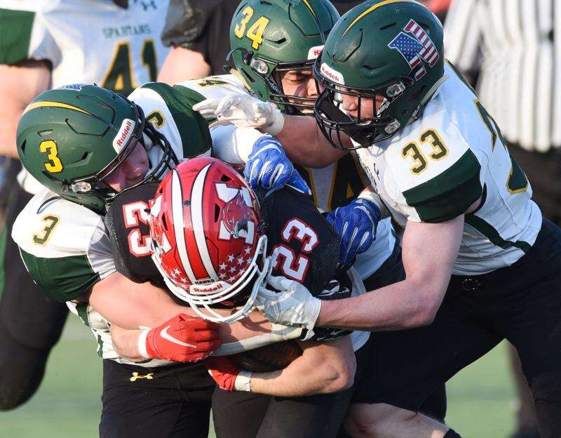 Spartans linebacker and long-snapper Aidan Casey, who later left the game with an injury while on punt return, sacked Leongas to get the defense off the field on Maine South's next possession. After that it was all Hawks.