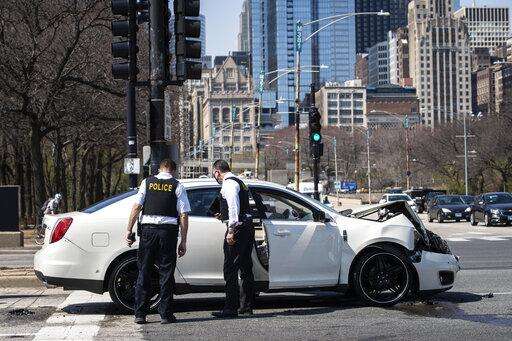 Chicago police investigate the scene of a shooting where a 2-year-old boy was shot in the head while he was traveling inside a car near Grant Park, Tuesday, April 6, 2021. (Ashlee Rezin Garcia/Chicago Sun-Times via AP)
