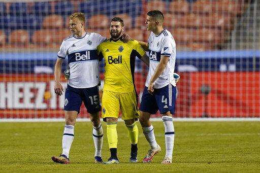 Vancouver Whitecaps' Andy Rose (15) and Ranko Veselinovic (4) celebrate with goalkeeper Maxime Crepeau (16) following their MLS soccer game against the Portland Timbers, Sunday, April 18, 2021, in Sandy, Utah. (AP Photo/Rick Bowmer)