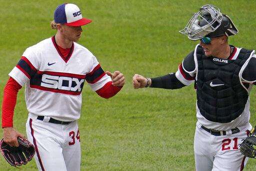 Chicago White Sox starting pitcher Michael Kopech, left, celebrates with catcher Zack Collins as they walk to the dugout after the fifth inning of a baseball game against the Texas Rangers in Chicago, Sunday, April 25, 2021. (AP Photo/Nam Y. Huh) The Associated Press