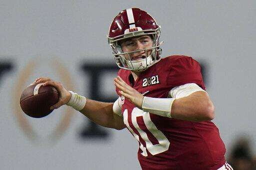 FILE - Alabama quarterback Mac Jones passes against Ohio State during the second half of an NCAA College Football Playoff national championship game in New Orleans, in this Monday, Jan. 11, 2021, file photo. Jones is a likely first round pick in the NFL Draft, April 29-May 1, 2021, in Cleveland.(AP Photo/Chris O'Meara, File) The Associated Press