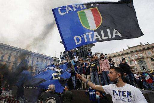 FILE - In this May 2, 2021, file photo, Inter Milan fans celebrate and shout slogans in Piazza Duomo square in front of the gothic cathedral after Inter Milan won its first Serie A title in more than a decade after second-placed Atalanta drew 1-1 at Sassuolo, in Milan, Italy. (AP Photo/Luca Bruno, File) The Associated Press