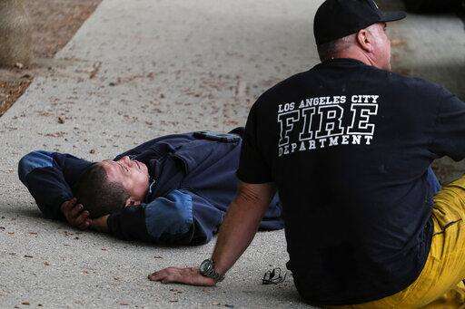 Los Angeles Fire Department firefighters rest during a wildfire in the Pacific Palisades area of Los Angeles, Sunday, May 16, 2021. (AP Photo/Ringo H.W. Chiu) The Associated Press