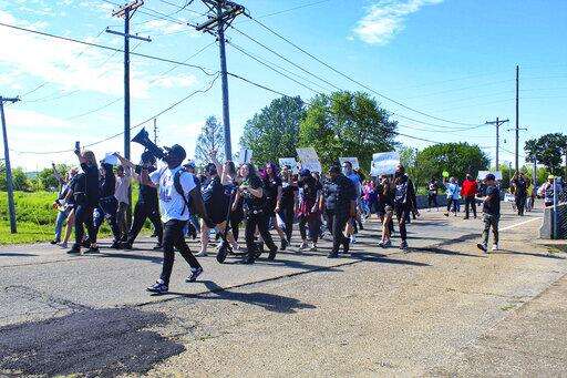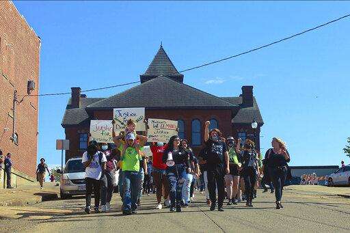 In this May 14, 2021, photo provided by Jeremiah Choka, about 100 racial justice activists staged a protest march in Fredericktown, Mo., questioning the death of Derontae Martin. His mother, grandmother and racial injustice activists are questioning how the young Black man ended up shot to death in April during a prom party inside the rural Missouri home of a middle aged man with a history of bigoted social media postings. They don't believe the findings of a preliminary investigation indicating that he took his own life. (Jeremiah Choka via AP) The Associated Press