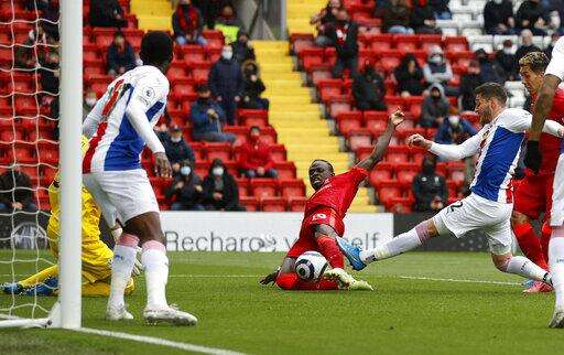 Liverpool's Sadio Mane scores his sides first goal during the English Premier League soccer match between Liverpool and Crystal Palace at Anfield stadium in Liverpool, England, Sunday, May 23, 2021. (Phil Noble/Pool via AP) The Associated Press