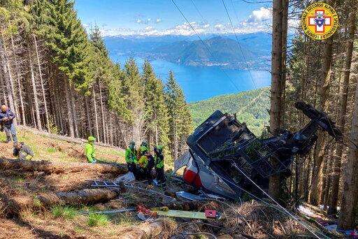 Fourteen people were killed when the lead cable of the Mottarone funicular overlooking Lake Maggiore in northern Italy snapped and the emergency brake failed to prevent the cable car from reeling at high speed backward down the support line. The cable car pulled off the line entirely after passing the support pylon, crashed to the ground and then rolled down the mountain until it was stopped by a stand of trees.