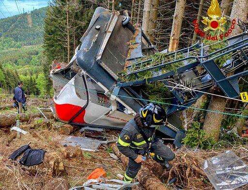Rescuers work by the wreckage of a cable car after it collapsed near the summit of the Stresa-Mottarone line in the Piedmont region, northern Italy, Sunday, May 23, 2021. A cable car taking visitors to a mountaintop view of some of northern Italy's most picturesque lakes plunged to the ground Sunday, killing at least nine people and sending two children to the hospital, authorities said. (Italian Vigili del Fuoco Firefighters via AP) The Associated Press