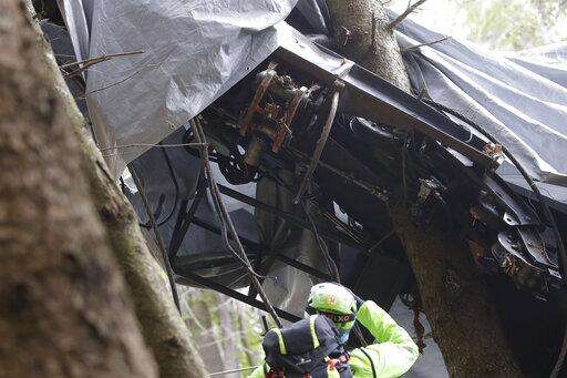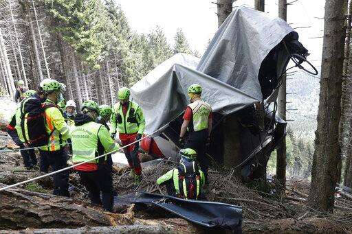 Rescuers search for evidence in the wreckage of a cable car after it collapsed near the summit of the Stresa-Mottarone line in the Piedmont region, northern Italy, Wednesday, May 26, 2021. Police have made three arrests in the cable car disaster that killed 14 people after an investigation showed a clamp, placed on the brake as a patchwork repair effort, prevented the brake from engaging after the lead cable snapped. (AP Photo/Luca Bruno) The Associated Press