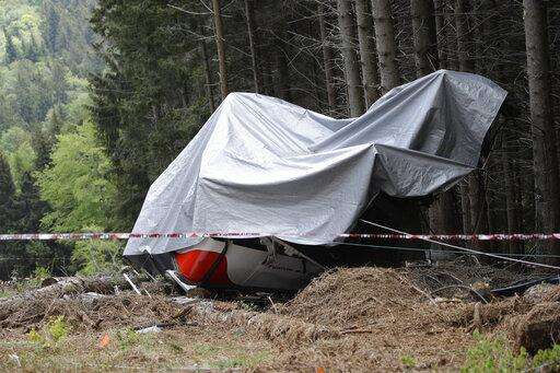 The wreckage of a cable car after it collapsed near the summit of the Stresa-Mottarone line in the Piedmont region, northern Italy, Wednesday, May 26, 2021. Police have made three arrests in the cable car disaster that killed 14 people after an investigation showed a clamp, placed on the brake as a patchwork repair effort, prevented the brake from engaging after the lead cable snapped. (AP Photo/Luca Bruno) The Associated Press
