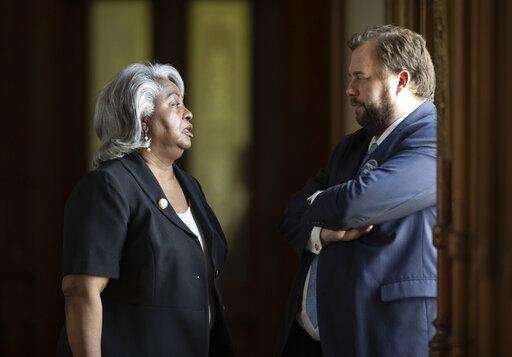 State Rep. Barbara Gervin-Hawkins, D - San Antonio, talks to state Rep. John Bucy, D - Austin, on the House floor at the Capitol in Austin, Texas, on Sunday May 30, 2021, before debate on Senate Bill 7, known as the Election Integrity Protection Act. (Jay Janner/Austin American-Statesman via AP) The Associated Press