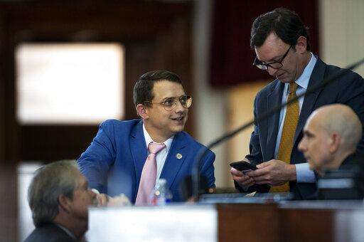 State Rep. Briscoe Cain, R - Deer Park, middle, and state Rep. Craig Goldman, R - Fort Worth, right, wait on the House floor for the start of the debate of Senate Bill 7, known as the Election Integrity Protection Act, at the Capitol on Sunday May 30, 2021, in Austin, Texas. (Jay Janner/Austin American-Statesman via AP) The Associated Press