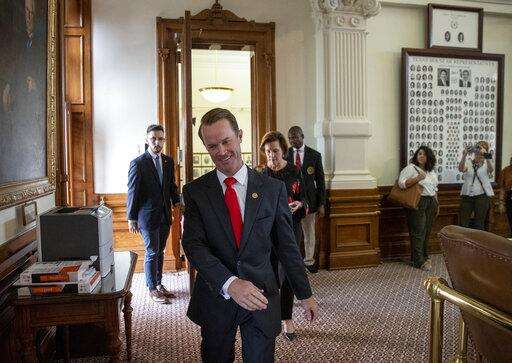 House Speaker Dade Phelan, R-Beaumont, emerges from a closed-door meeting with Democratic members of the Texas House before the start of the debate of Senate Bill 7, known as the Election Integrity Protection Act, at the Capitol on Sunday May 30, 2021, in Austin, Texas. (Jay Janner/Austin American-Statesman via AP) The Associated Press