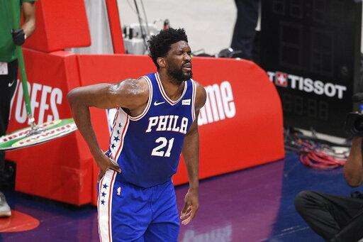 After staying down for a moment, a wincing Embiid rose and then put his hand on his lower right back.