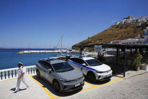 Volkswagen ID.4 electric cars of the Coast Guard and Police are parked on the Aegean Sea island of Astypalea, Greece during the official launch of a project to introduce and test electric vehicles and sustainable energy systems on Wednesday, June 2, 2021. The government has partnered with the German carmaker on the island project aimed a switching to electric vehicle use over the next five years. (Alexandros Vlachos/Pool via AP)