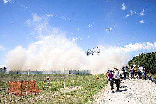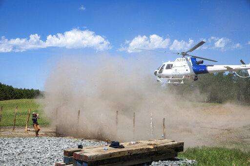 A Department of Homeland Security Helicopters uses its rotor wash to stir up dirt as activists take materials to build barricades at an occupied Enbridge Line 3 pump station near Park Rapids, Minn., on Monday, June 7, 2021. (Evan Frost/Minnesota Public Radio via AP)