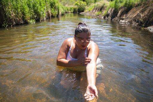 Rainee Thompson swims in the Mississippi River near an Enbridge construction site and the headwaters of the river, on Monday, June 7, 2021, in Clearwater County, Minn. More than 2,000 Indigenous leaders and "water protectors" gathered in Clearwater County from around the country to protest the construction of Enbridge Line 3. The day started with a prayer circle and moved on to a march to the Mississippi headwaters where the oil pipeline is proposed to be built. (Alex Kormann/Star Tribune via AP)
