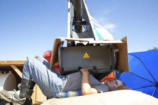 An activist who identified themselves as Chip sits chained to a piece of construction equipment at a Enbridge Line 3 pump station near Park Rapids, Minn., on Monday, June 7, 2021. (Evan Frost/Minnesota Public Radio via AP)