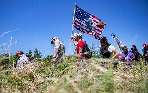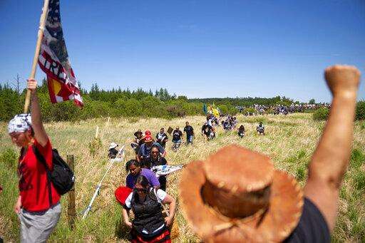 Indigenous leaders and "water protectors" march through swamp land to the boardwalk leading to an Enbridge pipeline construction site, on Monday, June 7, 2021, in Clearwater County, Minn. More than 2,000 Indigenous leaders and "water protectors" gathered in Clearwater County from around the country to protest the construction of Enbridge Line 3. The day started with a prayer circle and moved on to a march to the Mississippi headwaters where the oil pipeline is proposed to be built. (Alex Kormann/Star Tribune via AP)