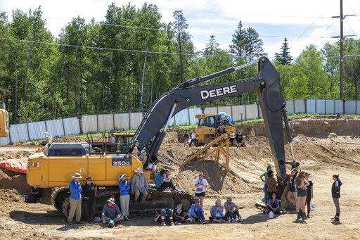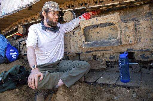 Activists sit on an around construction equipment while occupying an Enbridge Line 3 pump station near Park Rapids, Minn., on Monday, June 7, 2021. (Evan Frost/Minnesota Public Radio via AP)