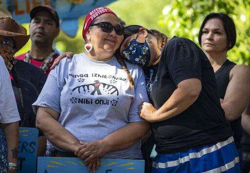 Nancy Beaulieu rests her shoulder on Everlasting Wind, aka Dawn Goodwin, during an interfaith prayer circle at LaSalle Lake State Recreation Area, on Monday, June 7, 2021, in Clearwater County, Minn. More than 2,000 Indigenous leaders and "water protectors" gathered in Clearwater County from around the country to protest the construction of Enbridge Line 3. The day started with a prayer circle and moved on to a march to the Mississippi headwaters where the oil pipeline is proposed to be built. (Alex Kormann/Star Tribune via AP)