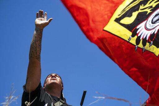 Roy Broncheau, aka Walks Through Hail, raises his hand to the sky after performing a prayer with tobacco on the bank of the Mississippi River, on Monday, June 7, 2021, in Clearwater County, Minn. More than 2,000 Indigenous leaders and "water protectors" gathered in Clearwater County from around the country to protest the construction of Enbridge Line 3. The day started with a prayer circle and moved on to a march to the Mississippi headwaters where the oil pipeline is proposed to be built. (Alex Kormann/Star Tribune via AP)