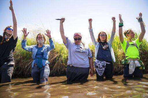Everlasting Wind, aka Dawn Goodwin, joins others by raising her fist in the Mississippi River near an Enbridge pipeline construction site, on Monday, June 7, 2021, in Clearwater County, Minn., to protest the construction of Enbridge Line 3. Goodwin is a co-founder of RISE Coalition. More than 2,000 Indigenous leaders and "water protectors" gathered in Clearwater County from around the country. The day started with a prayer circle and moved on to a march to the Mississippi headwaters where the oil pipeline is proposed to be built. (Alex Kormann/Star Tribune via AP)