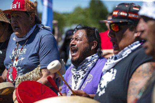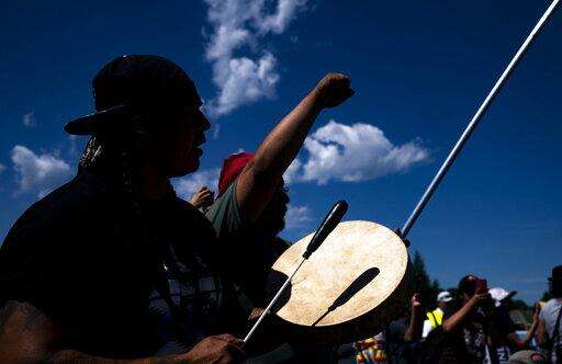 Jesse Barrientez, aka Red Feather, center, plays the drums and sings tribal songs with other Indigenous people during a march, on Monday, June 7, 2021, in Clearwater County, Minn. More than 2,000 Indigenous leaders and "water protectors" gathered in Clearwater County from around the country to protest the construction of Enbridge Line 3. The day started with a prayer circle and moved on to a march to the Mississippi headwaters where the oil pipeline is proposed to be built. (Alex Kormann/Star Tribune via AP)