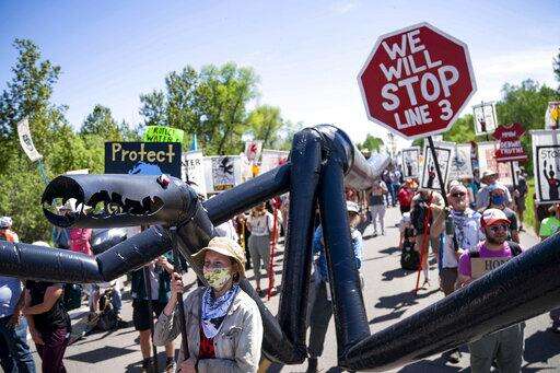 A makeshift "black snake" resembling a pipeline is carried as demonstrators march along Highway 9, on Monday, June 7, 2021, in Clearwater County, Minn. More than 2,000 Indigenous leaders and "water protectors" gathered in Clearwater County from around the country to protest the construction of Enbridge Line 3. The day started with a prayer circle and moved on to a march to the Mississippi headwaters where the oil pipeline is proposed to be built. (Alex Kormann/Star Tribune via AP)