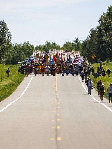 More than 2,000 Indigenous leaders and "water protectors" from around the country march along Highway 9 in Clearwater County, Minn., on Monday, June 7, 2021, in Clearwater County, Minn., to protest the construction of Enbridge Line 3. (Alex Kormann/Star Tribune via AP)