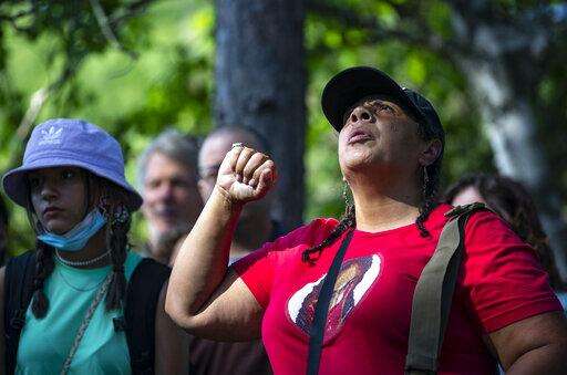 An Indigenous woman raises her fist during an interfaith prayer circle at LaSalle Lake State Recreation Area, on Monday, June 7, 2021, in Clearwater County, Minn., to protest the construction of Enbridge Line 3. More than 2,000 Indigenous leaders and "water protectors" gathered in Clearwater County from around the country. The day started with a prayer circle and moved on to a march to the Mississippi headwaters where the oil pipeline is proposed to be built. (Alex Kormann/Star Tribune via AP)