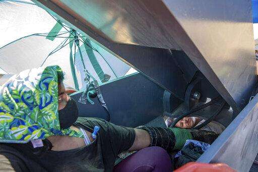 Two activists who declined to give their names sit chained together around a piece of construction equipment at an occupied Enbridge Line 3 pump station near Park Rapids, Minn., on Monday, June 7, 2021. (Evan Frost/Minnesota Public Radio via AP)