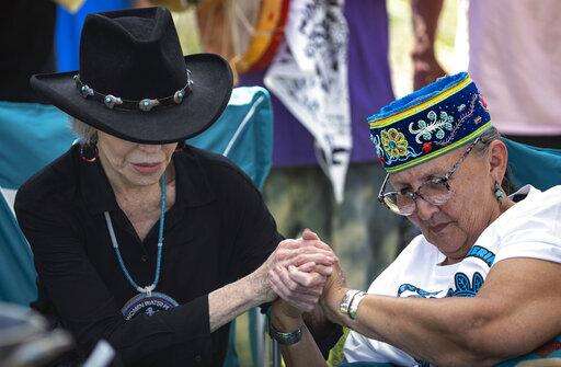 Actress and activist Jane Fonda, left, locks hands with Grandmother Mary Lyons after they prepared to perform a traditional water ceremony, on Monday, June 7, 2021, in Clearwater County, Minn. More than 2,000 Indigenous leaders and "water protectors" gathered in Clearwater County from around the country to protest the construction of Enbridge Line 3. The day started with a prayer circle and moved on to a march to the Mississippi headwaters where the oil pipeline is proposed to be built. (Alex Kormann/Star Tribune via AP)