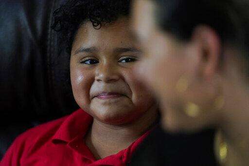 Emely sits with her mother, Glenda Valdez, during an interview in their home after they were reunited, Sunday, June 6, 2021, in Austin, Texas. It had been six years since Valdez said goodbye to her daughter Emely in Honduras. Then, last month, she caught a glimpse of a televised Associated Press photo of a little girl in a red hoodie and knew that Emely had made the trip alone into the United States. On Sunday, the child was returned to her mother's custody. (AP Photo/Eric Gay)