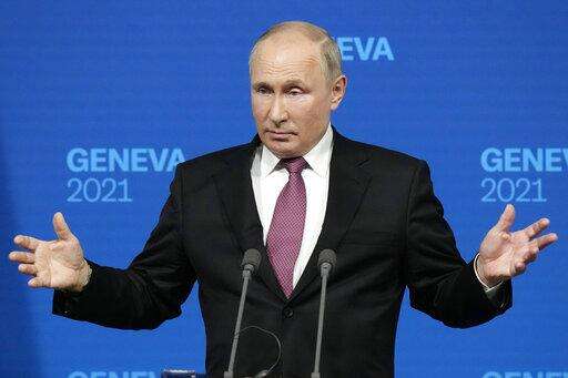 Russia's President Vladimir Putin gestures as he addresses the media during a press conference after the U.S.-Russia summit with U.S. President Joe Biden at Villa La Grange in Geneva, Switzerland, Wednesday, June 16, 2021. (Denis Balibouse/Pool Photo via AP) The Associated Press