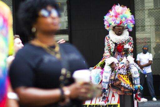 People wait to perform during a free outdoor event organized by The Broadway League during Juneteenth celebrations at Times Square on Saturday, June 19, 2021, in New York. Parades, picnics and lessons in history marked Juneteenth celebrations in the U.S., a day that marks the arrival of news to enslaved Black people in a Texas town that the Confederacy had surrendered in 1865 and they were free. (AP Photo/Eduardo Munoz Alvarez)