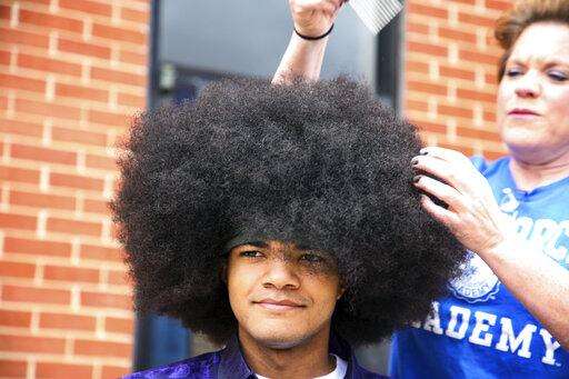 In this photo provided by Gregg Gelmis, Kieran Moïse, 17, has his 19-inch hair cut and donated to the nonprofit Children With Hair Loss, which provides human hair replacements to children and teenagers facing medically-related hair loss, on Saturday, May 29, 2021, in Huntsville, Ala. Moïse also launched a fundraiser through St. Jude Children's Research Hospital in memory of classmate Josh Quist, who died from cancer. So far their charity, "Kieran's Curls for Cancer," has raised $35,000. (Courtesy of Gregg Gelmis via AP)
