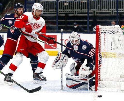 THIS CORRECTS THAT KIVLENIEKS DIED OF CHEST TRAUMA FROM AN ERRANT FIREWORKS MORTAR BLAST AND NOT A SUBSEQUENT FALL AS AUTHORITIES PREVIOUSLY REPORTED - FILE - Columbus Blue Jackets goalie Matiss Kivlenieks, right, stops a shot in front of Detroit Red Wings forward Valtteri Filppula, center, and Blue Jackets defenseman Vladislav Gavrikov during the first period of an NHL hockey game in Columbus, Ohio, in this Saturday, May 8, 2021, file photo. The Columbus Blue Jackets and Latvian Hockey Federation said Monday, July 5, 2021, that 24-year-old goaltender Matiss Kivlenieks has died. A medical examiner in Michigan says an autopsy has determined that Columbus Blue Jackets goaltender Matiss Kivlenieks died of chest trauma from an errant fireworks mortar blast, and not a fall as authorities previously reported. Police in Novi, Michigan, said the mortar-style firework tilted slightly and started to fire toward people nearby Sunday night, July 4. (AP Photo/Paul Vernon, File)