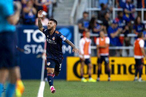 FC Cincinnati midfielder Luciano Acosta (11) celebrates after scoring against the Columbus Crew during an MLS soccer match Friday, July 9, 2021, in Cincinnati. (Albert Cesare/The Cincinnati Enquirer via AP)