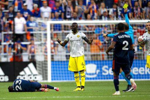 Columbus Crew defender Jonathan Mensah (4) receives a yellow card after tackling FC Cincinnati forward Isaac Atanga (23) during the first half in an MLS soccer match Friday, July 9, 2021, in Cincinnati. (Albert Cesare/The Cincinnati Enquirer via AP)