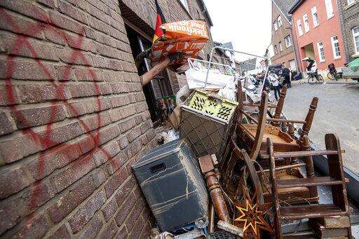 A pile of discarded furniture stands in front of a house in the district of Blessem, in Ergfstadt, Germany, Thursday July 22, 2021. In the flood disaster area of Erftstadt-Blessem, some residents are being allowed back into their homes to clear debris after heavy rains caused devastating floods. (Marius Becker/dpa via AP) The Associated Press