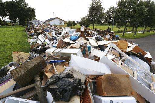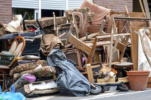 Bulky Piles of waste goods line a street after floods destroyed many homes in the village of Stotzheim, Germany, Thursday July 22, 2021. In the flood disaster area of Erftstadt-Blessem, some residents are being allowed back into their homes to clear debris after heavy rains caused devastating floods. (David Young/dpa via AP) The Associated Press