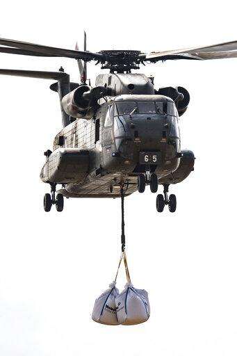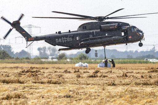 A Bundeswehr CH-53 transport helicopter picks up big bags of ballast in Ergfstadt, Germany, Thursday July 22, 2021, to fly them to the Blessem district to damn up the banks of the Erft river. In the flood disaster area of Erftstadt-Blessem, some residents are being allowed back into their homes to clear debris after heavy rains caused devastating floods. (Marius Becker/dpa via AP) The Associated Press